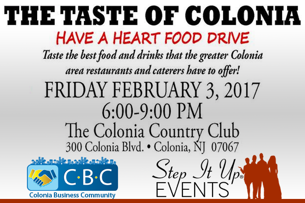 Please join us Friday February 3th for the 6th annual Taste of Colonia hosted at the Colonia Country Club. This food and drink fundraiser featuring the greater Colonia area restaurants, for the benefit of Woodbridge Township Food Banks by contributing to the Have-A-Heart Food Drive. We are also collecting non perishable food at the event.